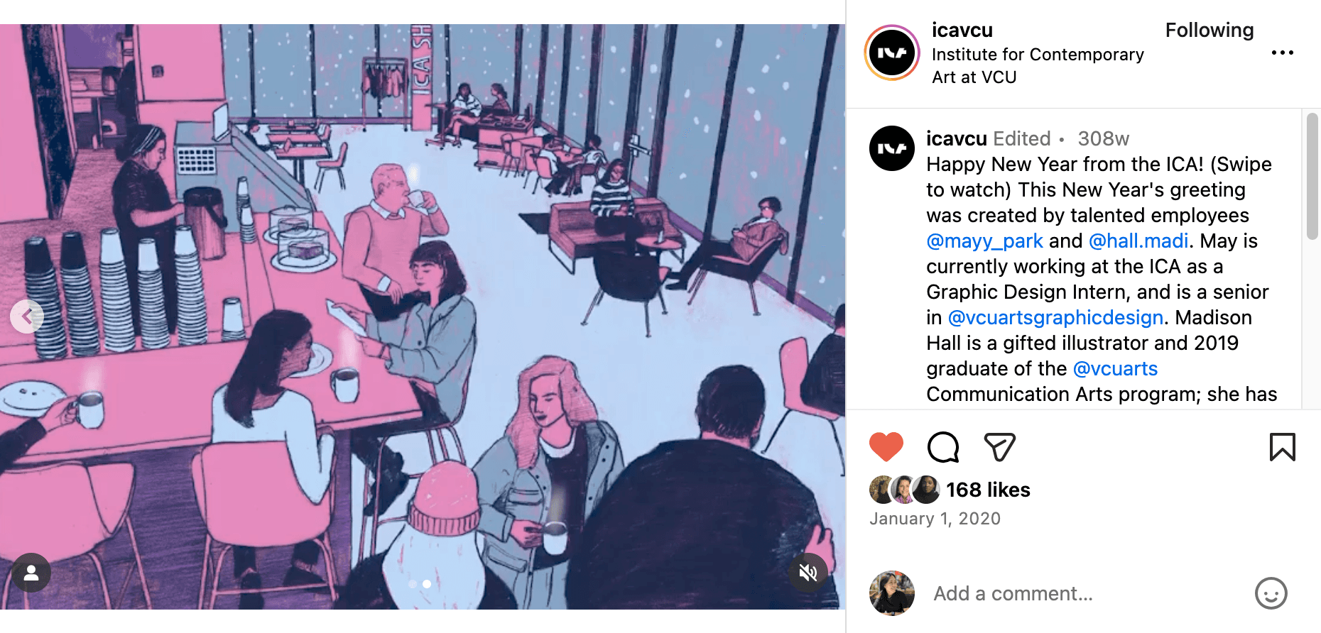 I collaborated with Madison Hall, an illustrator and Visitor Experience Associate at the Institute for Contemporary Art. We created an animated New Year’s greeting card that delivers the message of the ICA as a space for art, inquiry, and exploration.