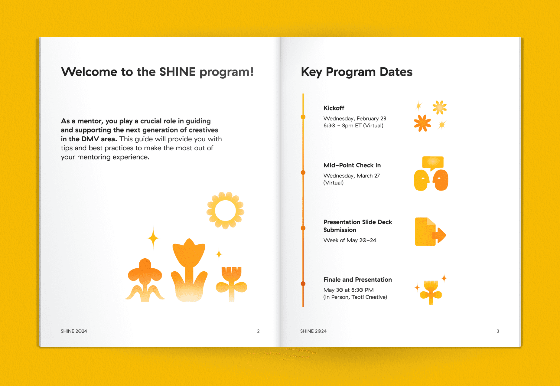 I designed a guidebook for AIGA DC’s SHINE program to help mentors and mentees connect, learn, and collaborate.